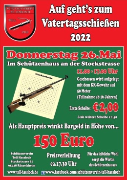 Wir freuen uns in diesem Jahr wieder unser Vatertagsschießen veranstalten zu dürfen. Geschossen wird an 18. Mai aufgelegt mit Kleinkaliber Gewehr auf Glücksscheiben. Als Hauptpreis winkten 150 Euro.