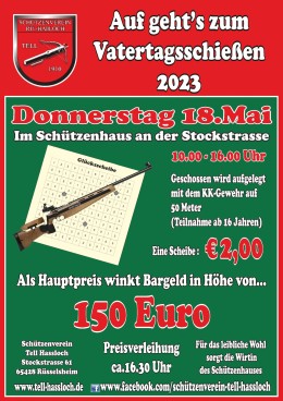 Das Vatertagsschießen in Tell Haßloch findet bereits seit über 50 Jahren in dem Verein statt und ist nach dem Ostereierschießen das zweitgrößte Event. Dabei allerdings das einzige Event, bei dem mit scharfen Waffen geschossen wird. Teilnahme ist somit erst ab 16 Jahren möglich.