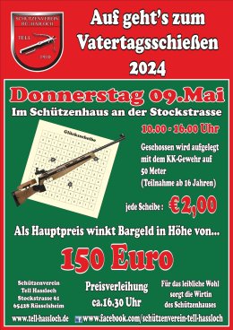 Wir freuen uns in diesem Jahr wieder unser Vatertagsschießen veranstalten zu dürfen. Geschossen wird an 9. Mai aufgelegt mit Kleinkaliber Gewehr auf Glücksscheiben.